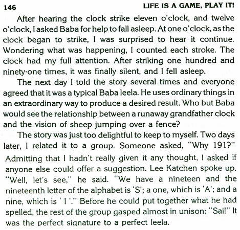 Incidentally, why she carefully avoided other SB statements about life, such as "Life is a prison, all must endure it" (p. 12, Dharma Vahini) , "Life is a game of football: you are the ball" (p. 331 Sathya Sai Speaks Vol. 14),"Life is filled with bondages" (p. 92 Sanathana Sarathi, April 1998) one can but surmise. Her chosen titles are hardly representative of the contents, they are more of a sop to Sai Baba which would increase the chance of him blessing the book. The contents are very much about how Sai Baba affected her in various ways (a lot about herself), details of interviews and his 'teachings' how she found esoteric meanings hidden in his words and acts (invariably far-fetched or quite trivial symbolic interpretations) and how the Sai Baba group centre reacted to Baba, her stories and opinions. The books always had numerous photos of herself and Raye with Sai Baba, receiving blessings of various kinds - book signings, vibuthi 'production' and so forth .Further down here, I select two excerpts from 'Life is a Game, Play It' which are representative of her written materials.